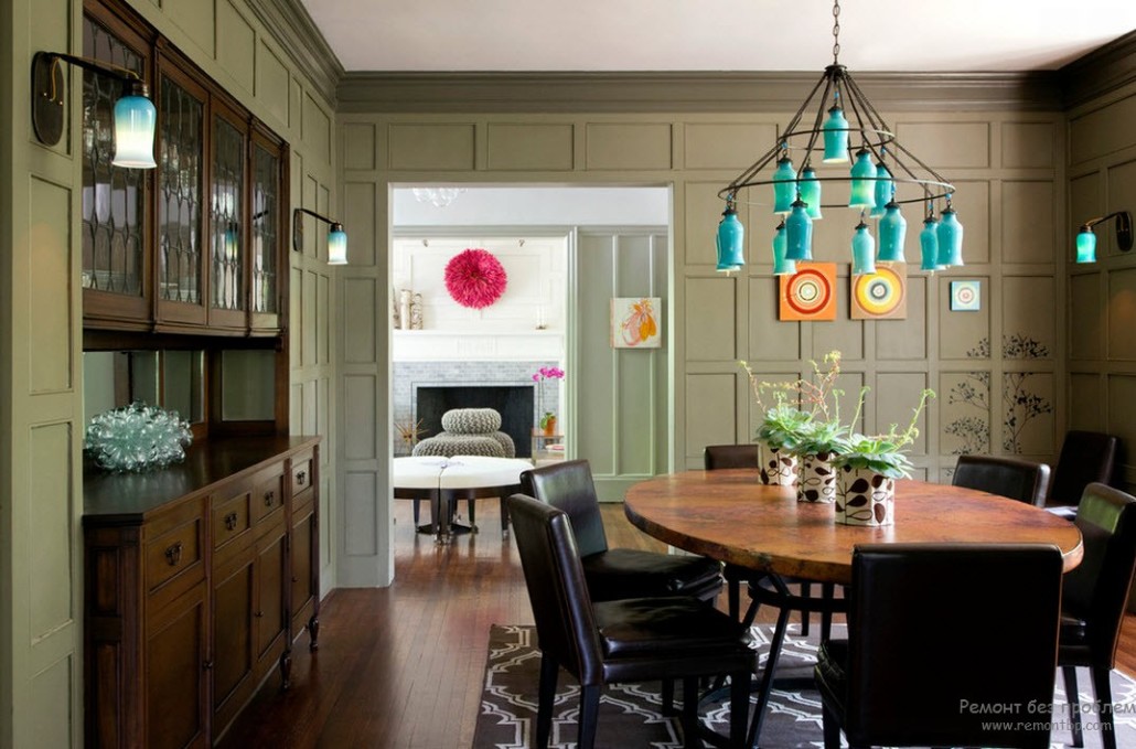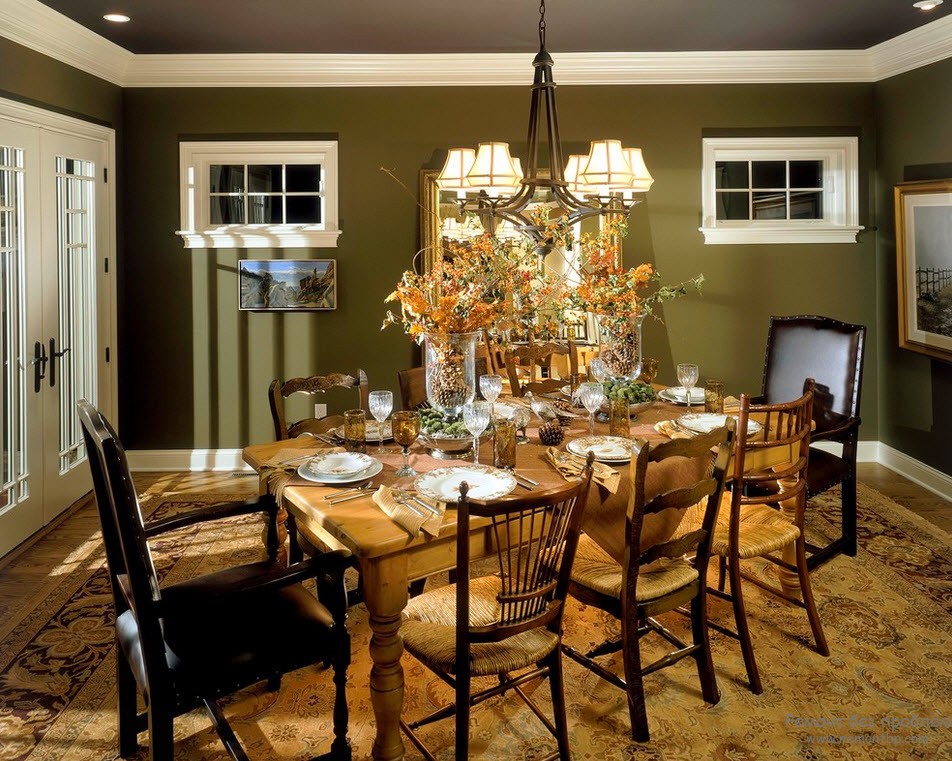 Оливковый цвет поглощает свет, поэтому не стоит делать всю комнату в одном цвете. В ней должны присутствовать светлые тона. Чем отличаются эти комнаты? Мягкостью оливкового оттенка, освещенностью, и количеством смягчающего белого цвета. Поэтому первый вариант выглядит более празднично и весело, но и второй не лишен своей привлекательности. В этой столовой установлена большая люстра, которая сделает комнату теплее, но, лишь при условии применения теплого света, близкого к солнечному, потому что лампы с холодным светом могут сделать его мрачным.