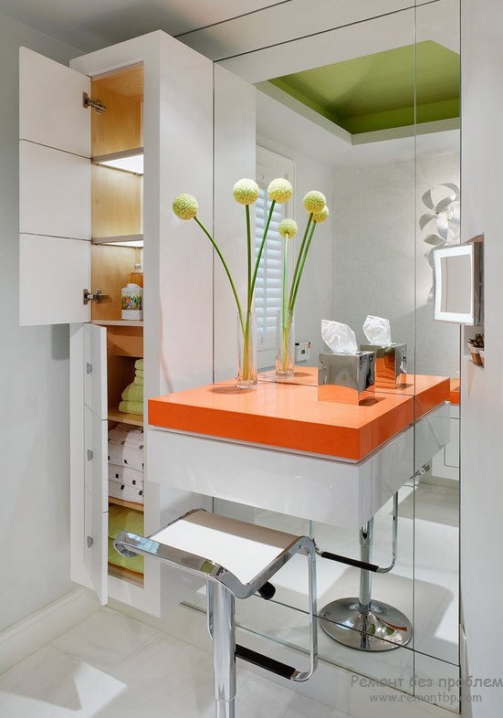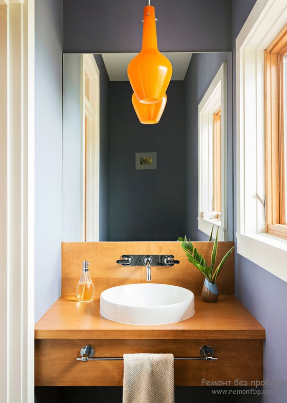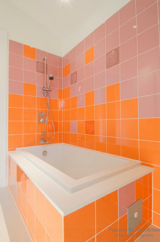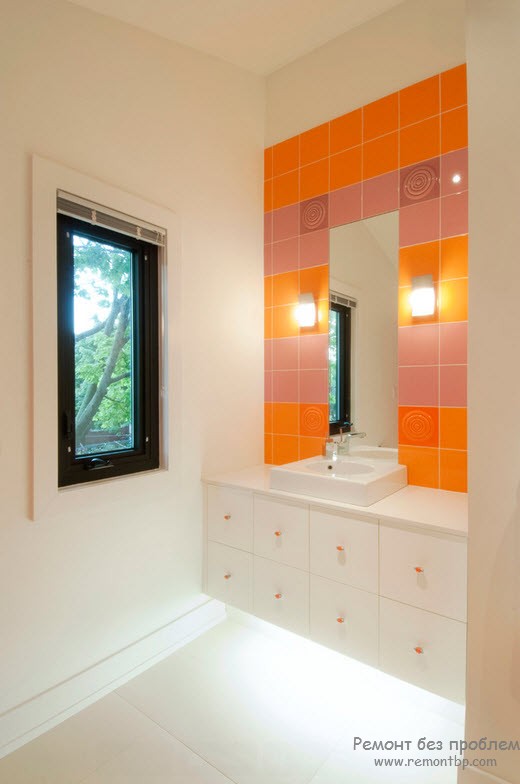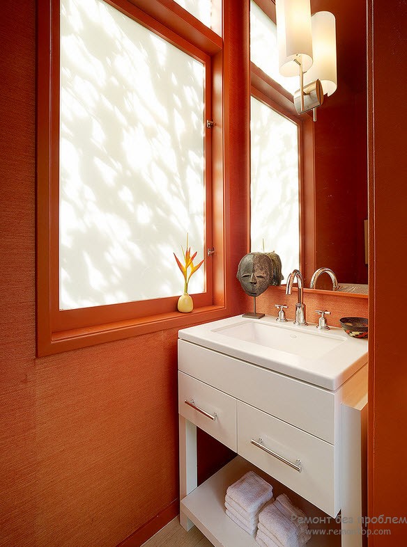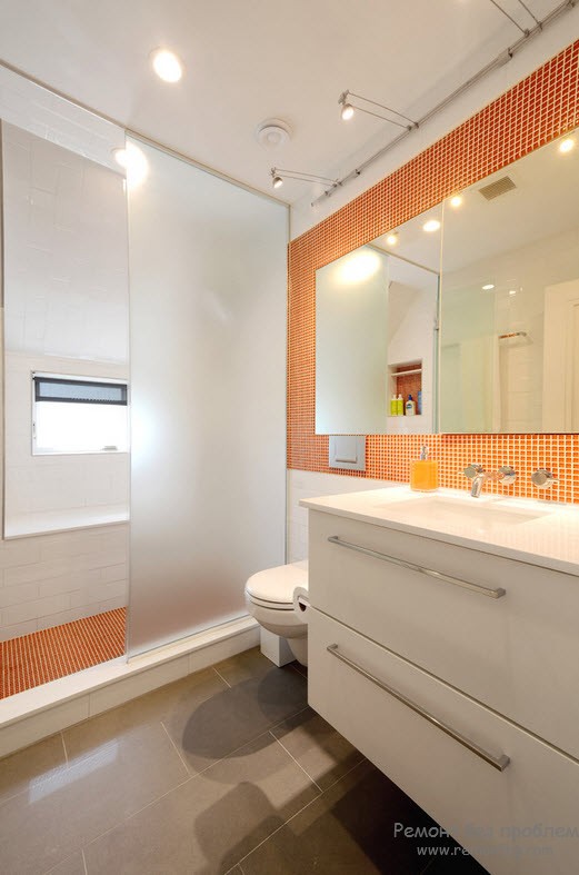 Стимулирующие особенности цвета ограничивают его самостоятельное использование. Но если вы поклонник фрукта, оформите апельсиновым тоном стены и потолок. Проблему организации верхней части комнаты решит натяжная модель, а стен – классика плитки. При таком выборе предпочтительной будет глянцевая модель потолочного декора со встроенным освещением. К нему подойдет коричневый плиточный или теплый пол. И все ж такой дизайн сузит пространство, если в нем нет большого окна и много стекла. Для коррекции, при условии отсутствия проема, потребуется стеклянная панель для душа, большие зеркала, расположенные на противоположных стенах, и белые аксессуары. Зеркала не должны висеть напротив – сместите их немного по сторонам. Пол предпочтительно сделать светлым. Как вариант – воспроизведите на одной из стен панно из стеклянной мозаики нежного цвета, например, персикового.