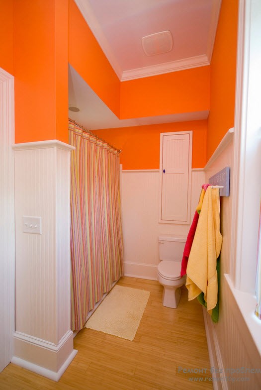 И все же стены в ванной необязательно должны быть облицованы плиткой. Современные технологии представлены группой новых отделочных материалов, хотя вполне достойно может выглядеть краска или влагостойкие обои, позволяющие точнее определиться с нюансами в оттенках. Впечатления от цвета усилят кабины для душа и ванна. Выпускается и оранжевая сантехника. Акриловые изделия представлены всей гаммой цветов, но не всегда можно найти требуемый оттенок. Классическая белая чаша удачно впишется в яркий интерьер.