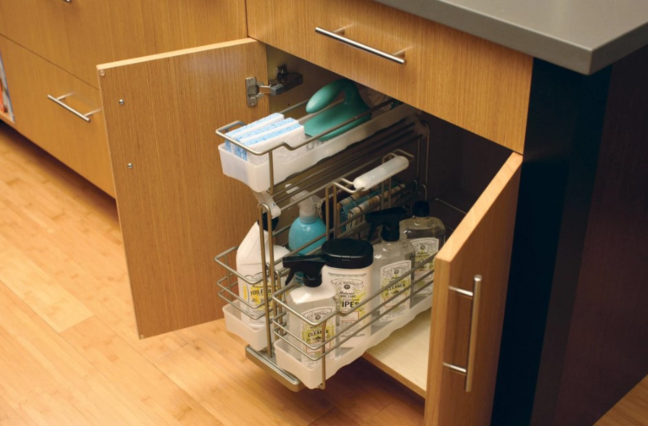 Не стоит упускать возможность задействовать место под раковиной. Обычно шкаф оснащен дверцей, поэтому здесь допустимо расположить бытовую химию, перчатки и полотенца.