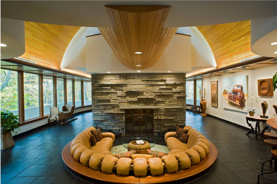 Рассмотрим далее оформление некоторых внутренних помещений большого загородного дома с необычной архитектурой. И начнем с самого просторного помещения первого этажа – огромной гостиной, разделенной с помощью камина в межкомнатной перегородке, на две зоны. Большие панорамные окна, оригинальная конструкция потолков, контрастные цветовые решения для оформления интерьера, фактурные элементы отделки – все в этом пространстве работает на создание уникального образа гостиной.