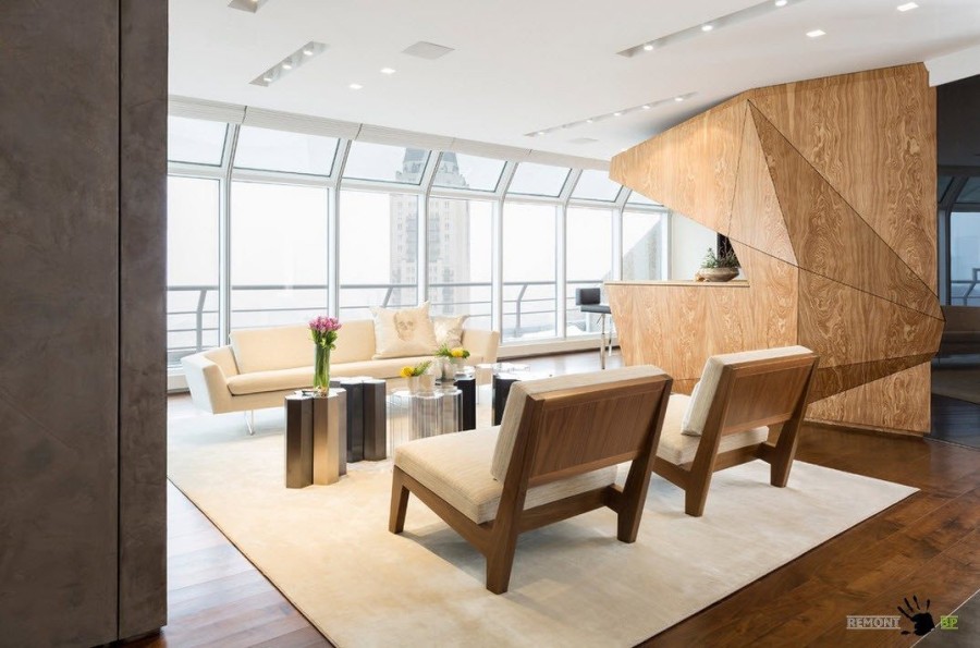 Необычные потолки привлекают внимание посетителей и дают возможность удобно расположить обилие светильников. Необычный журнальный столик нестандартной формы имеет скорее декоративное назначение и подойдет для установки на нем вазы с цветами или статуэтки.