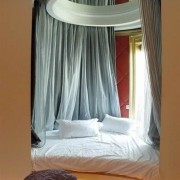 - остров – кровать устанавливается особым образом так, чтобы она не могла касаться стен, образуя своеобразный остров. В данном случае она может иметь массивную конструкцию и состоять из громоздкого каркаса¸ навеса и полога;