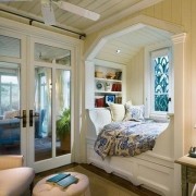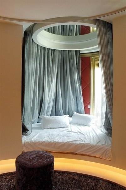 - в нише. Допускается интегрировать спальное ложе в нишу, которая может быть контрастной на общем фоне интерьера или же зашторенной оригинальной эффектной тканью;