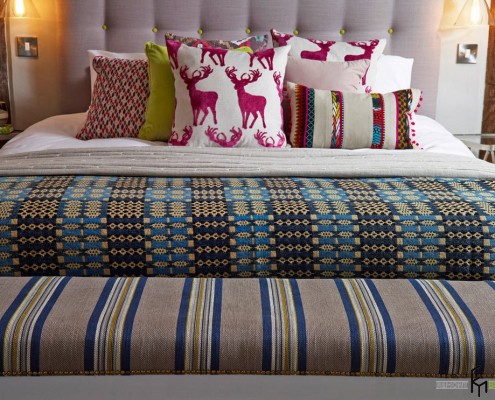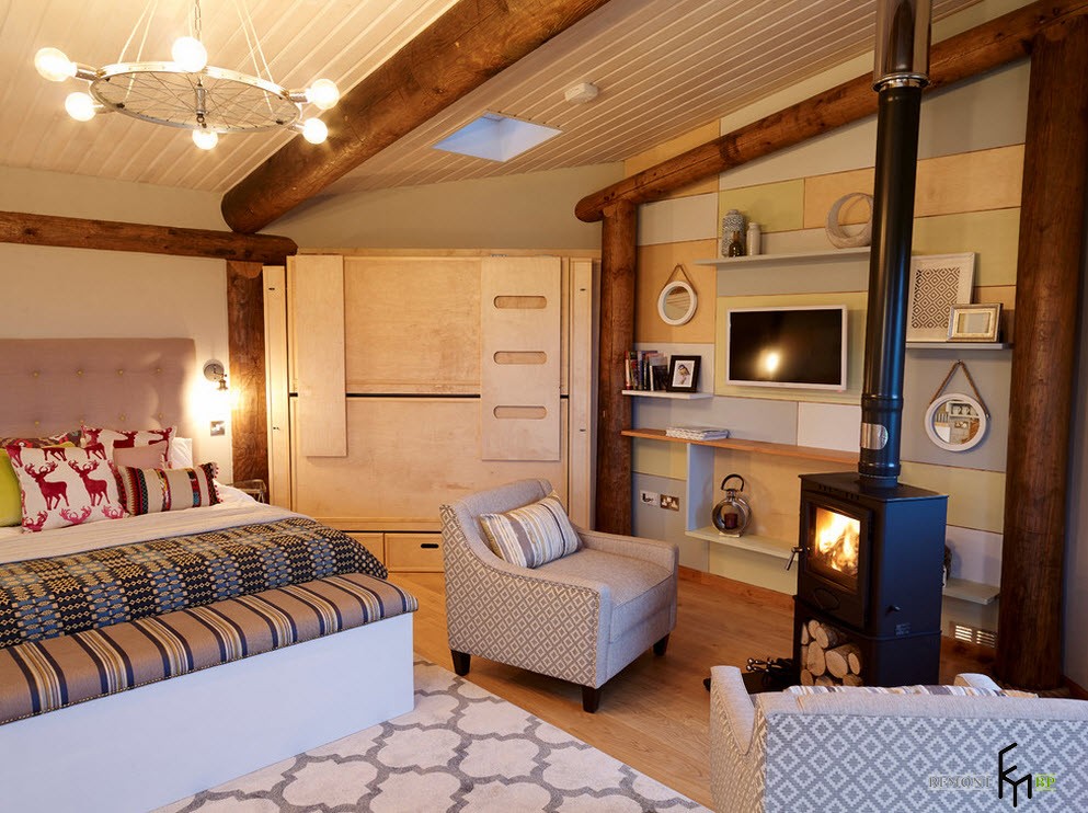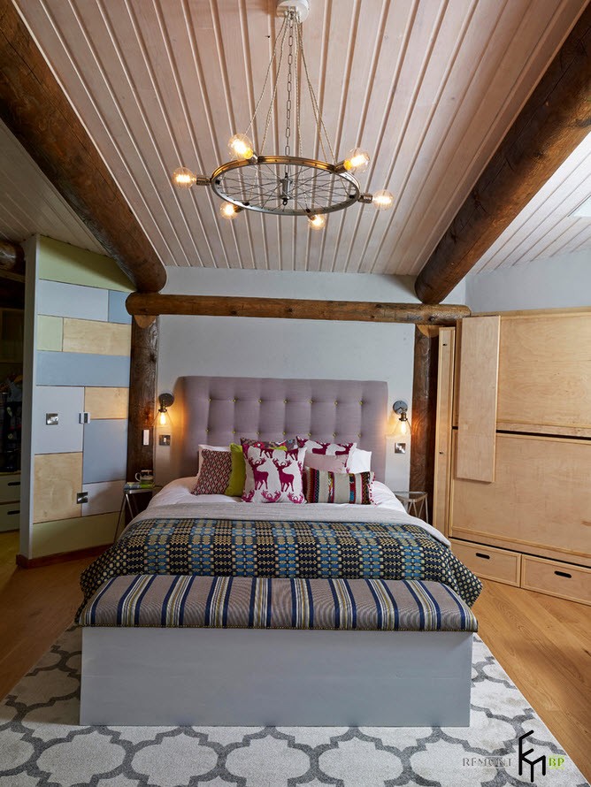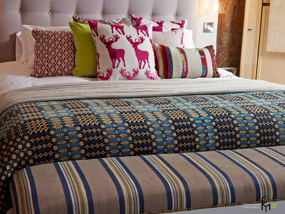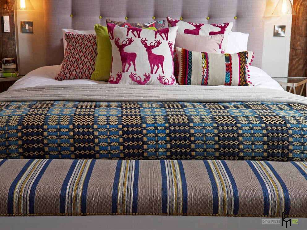 Стиль интерьера соединил в себе различные направления кантри, именно это и составляет его самобытную особенность. Текстильные аксессуары выполнены из натуральных тканей различной фактуры и текстуры: это гладкие и рельефные, однотонные и жаккардовые полотна. Диванные подушки разнообразной формы, с вышивкой и аппликацией. Такая кровать напоминает стиль бохо: