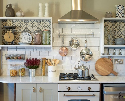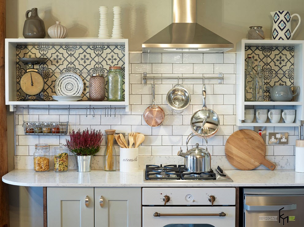 Задняя стенка в кухонных полках – это кафельная плитка с росписью, повторяющейся на керамической посуде: