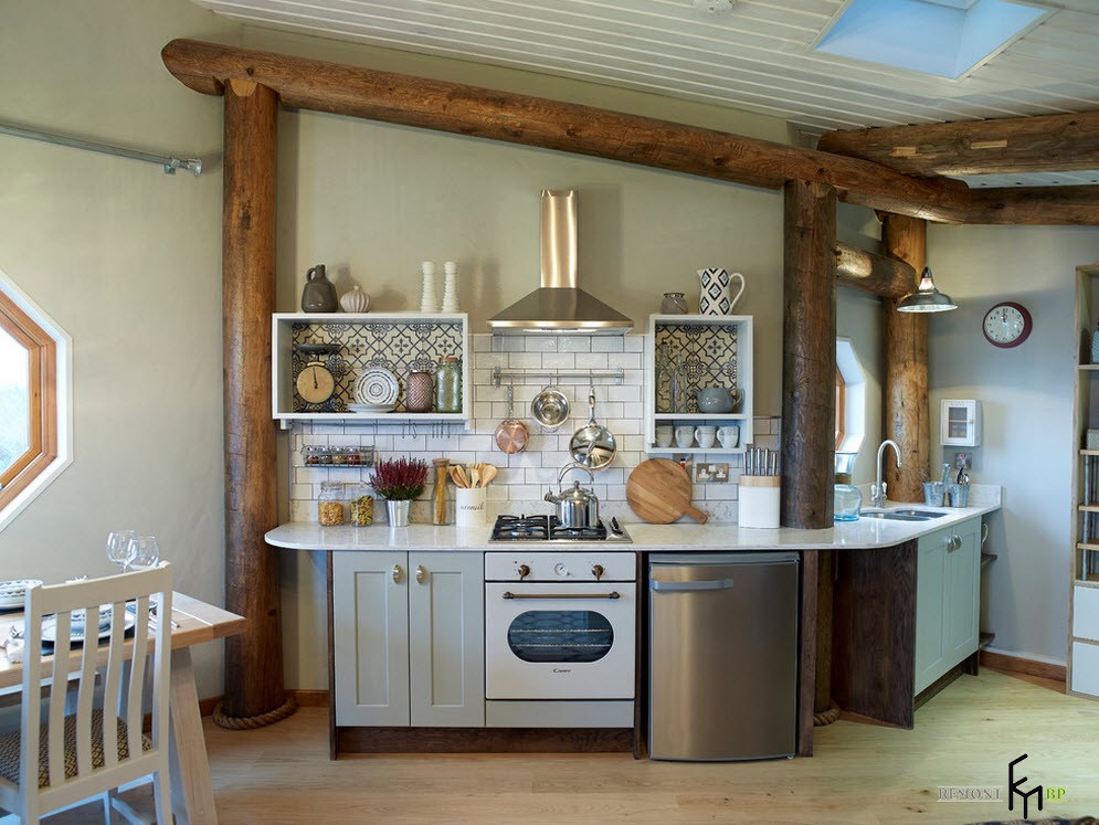 Балки из натурального дерева не только служат декоративным элементом, подчеркивающим деревенский стиль интерьера, но и выполняют функцию несущей опоры: