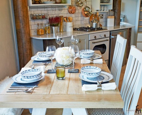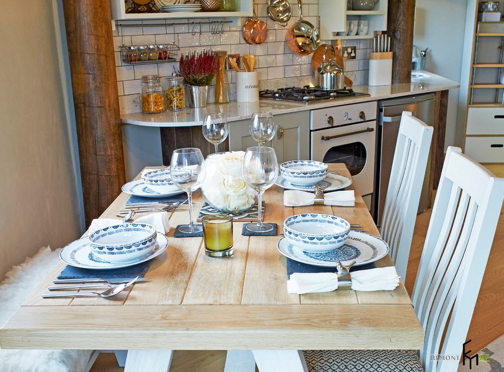 Столовая посуда и аксессуары для сервировки выбраны в сине-белой гамме. Керамические тарелки с простой незамысловатой росписью подчеркивают изящество прозрачных фужеров. Даже кольца для салфеток декорированы деревенским символом – птичкой: