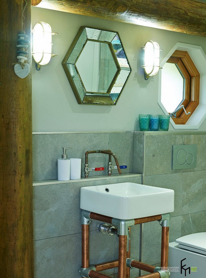 Интерьер ванной комнаты близок к стилю лофт: необычная конструкция смесителей и подставки под раковину, светильники. Однако деревянные детали смягчают грубоватость таких деталей. Форма зеркала рифмуется с конфигурацией окна: