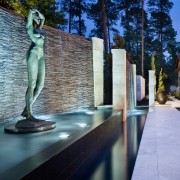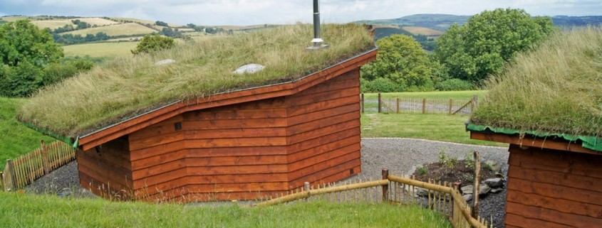 Первое, на что обращает внимание экстерьер этого домика, – крыша. Односторонняя покатая форма, покрыта травяным газоном. Такая «растительная» крыша не только служит оригинальным украшением. Она выполняет роль кондиционера, защищая дом от перегрева, служит отличным звукоизоляционным противопожарным материалом: