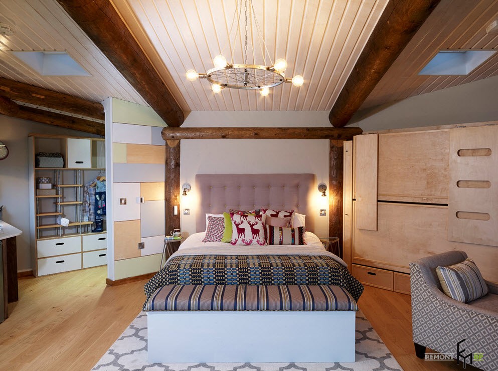 Все предметы мебели и декора компактны и функциональны. Все зоны распределены с учетом своего назначения и рационализаторских принципов. Так, спальное место отгорожено от входа перпендикулярной стеной, которая одновременно является изголовьем кровати. От этой стены под тупым углом смонтированы еще две перегородки. Одна из них – шкаф с раздвижными дверями, а на другой установлены электрические розетки и выключатели:
