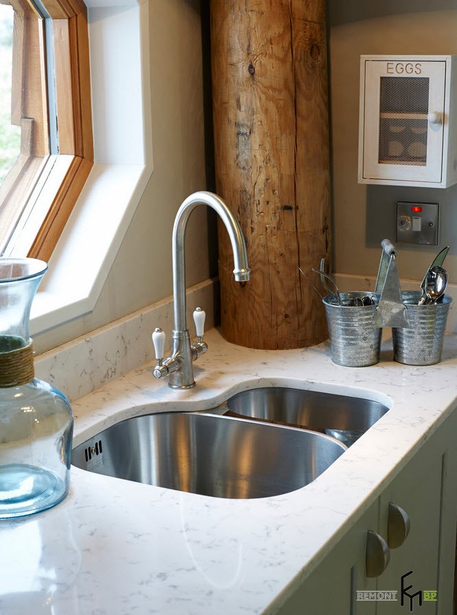 Конструкция кухонной мойки компактная и удобная: в ней два отделения, водопроводные и канализационные трубы спрятаны в полость балки: