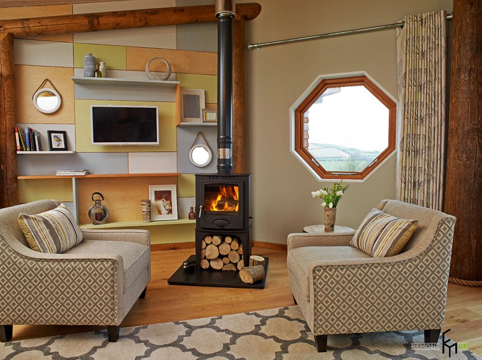 Камин в таком малогабаритном помещении сконструировать сложно, но можно использовать миниатюрную модель биокамина, а настоящие поленья использовать как элемент декора: