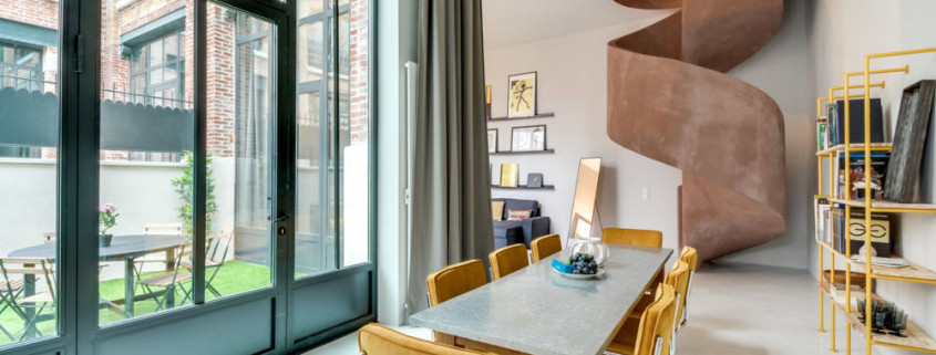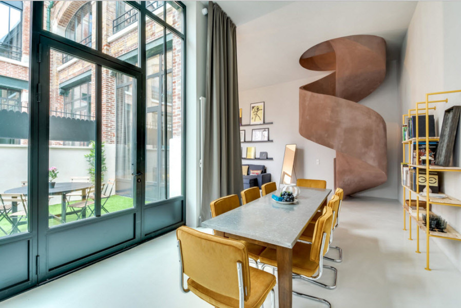 Представляем вам дизайн-проект интересных апартаментов, разместившихся в здании с индустриальным прошлым. Дабы сохранить традиционный дух промышленных помещений, в обустроенном под жилище пространстве были сохранены огромные окна с металлическими рамами. Именно эти панорамные окна стали отправной точкой в создании концепции оформления городской квартиры. Невероятно светлое помещение с высокими потолками и белоснежной отделкой стен стало отличным фоном для размещения контрастной меблировки и предметов декора. У апартаментов интересное размещение – они занимают угол здания, расположившись по обе стороны на два этажа.