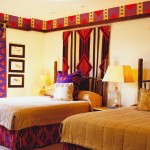 Сочетания цветов в индийском стиле довольно разнообразно, при этом наиболее популярны расцветки национальных орнаментов и мотивов. А настенные тканые панно и ковры (преимущественно – ручной работы) изображают реалии старины или современности. Броская деталь интерьера – валики или многочисленные небольшие подушки с цветастым орнаментом. Вместо покрывала зачастую используются ковры ручной работы или ткань.