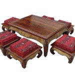 Классические атрибуты стиля – деревянные, стеклянные каменные или чугунные (возможно комбинированные) низкие журнальные столики, используемые, в том числе и для чаепития, и такие же маленькие стулья, ротанговое кресло-качалка и невысокая скамеечка для ног. Вместо привычных тумбочек для хранения вещей можно использовать деревянные сундуки. Вообще, ротанг – оптимальное решение для декоративных элементов интерьера. Изящно и необычно красиво смотрятся экзотические растения жарких тропиков в больших ротанговых напольных вазонах.