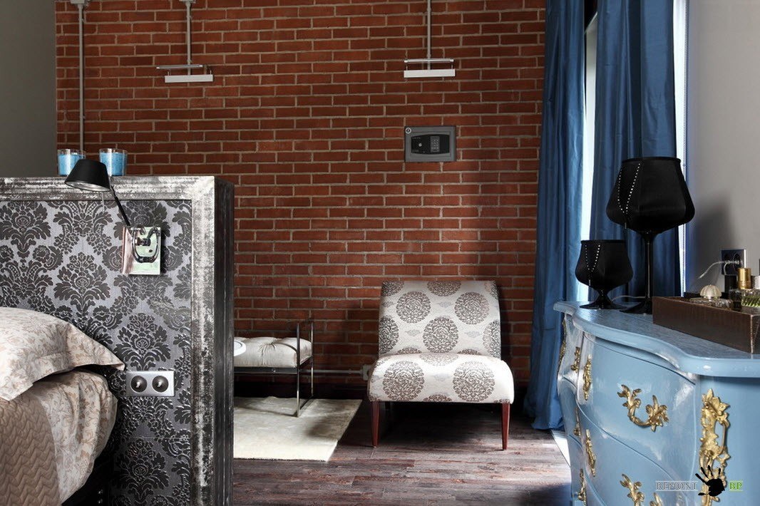 Далее мы заглянем в спальню, которая оформлена весьма эклектично. Здесь мы можем наблюдать влияние различных стилистик интерьера, как на отделку, так и на меблировку спальни. Кирпичная стена в качестве акцента, синий текстиль для оформления окон, оригинальный голубой комод в стиле барокко и необычные черные настольные лампы – все в этой комнате работает на создание оригинальной, нетривиальной обстановки.