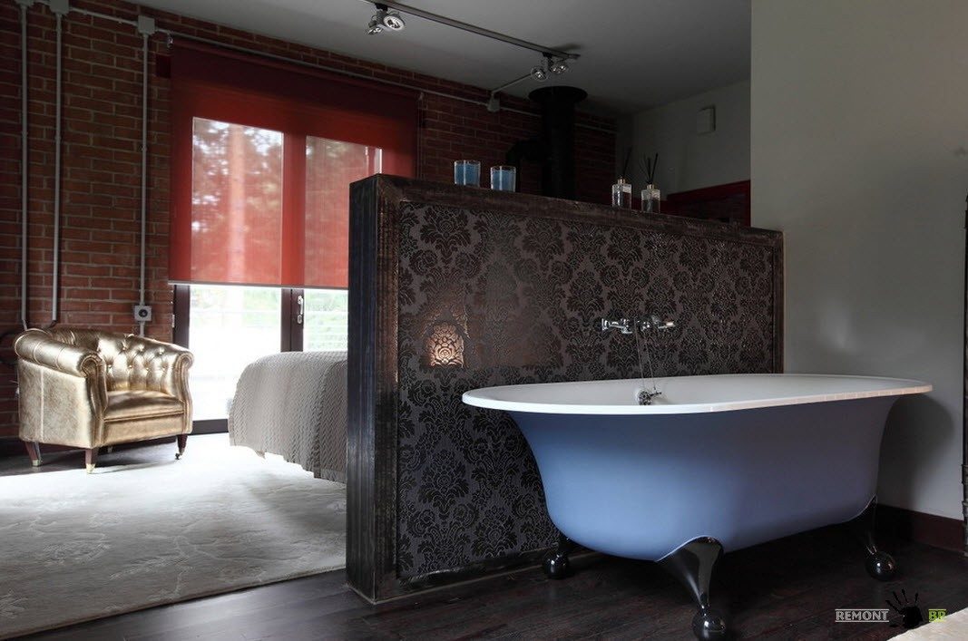 Изголовье большой кровати представляет собой ширму, отделанную металлом и текстильными обоями. Эта конструкция выполняет двойную функцию и является стеной в пространстве для принятия водных процедур.