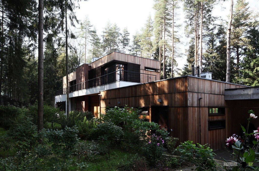 Двухэтажное здание с оригинальным экстерьером расположилось в очень живописном месте с множеством хвойных деревьев вокруг. Контрастные сочетания цветов, использованные в отделке дома, позволяют ему выделяться не только среди деревьев, но и среди соседних здания. Здание из стекла и бетона могло бы казаться «прохладным», с мотивами индустриальности, если бы не теплый коричневый цвет оформления оконных и дверных проемов и не облицовка некоторых вертикальных поверхностей с помощью реечных панелей из древесины.