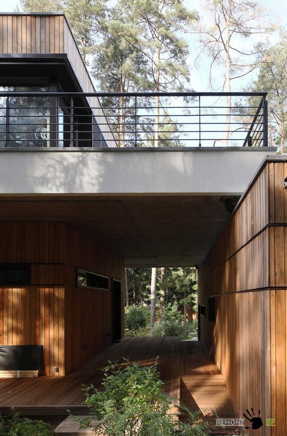 В планировке здания было применено много интересных конструктивных и дизайнерских ходов. И речь не только о большом балконе, расположенном практически по периметру всего второго этажа, но и навесах, которые создает крыша верхнего уровня над деревянным помостом.
