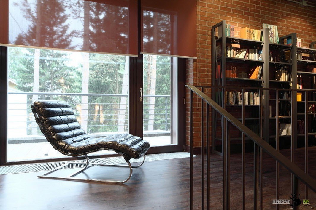 Для того, чтобы попасть на второй этаж, мы поднимаемся по металлической лестнице, которая очень похожа на промышленный элемент конструкции. Открытые книжные стеллажи из металла также добавляют индустриальности обстановки пространства между лестницей и личными комнатами.