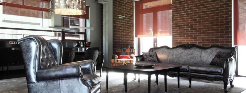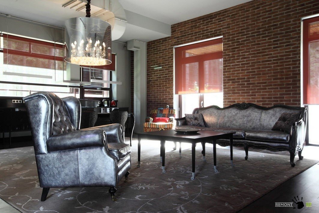 Далее следуем в просторную гостиную, где кирпичная кладка в оформлении стен не покидает нас, равно как и открытые коммуникации, конструкции перекрытий. На фоне такой индустриальной отделки особенно впечатляюще смотрится мягкая мебель в классическом стиле с кожаной обивкой.