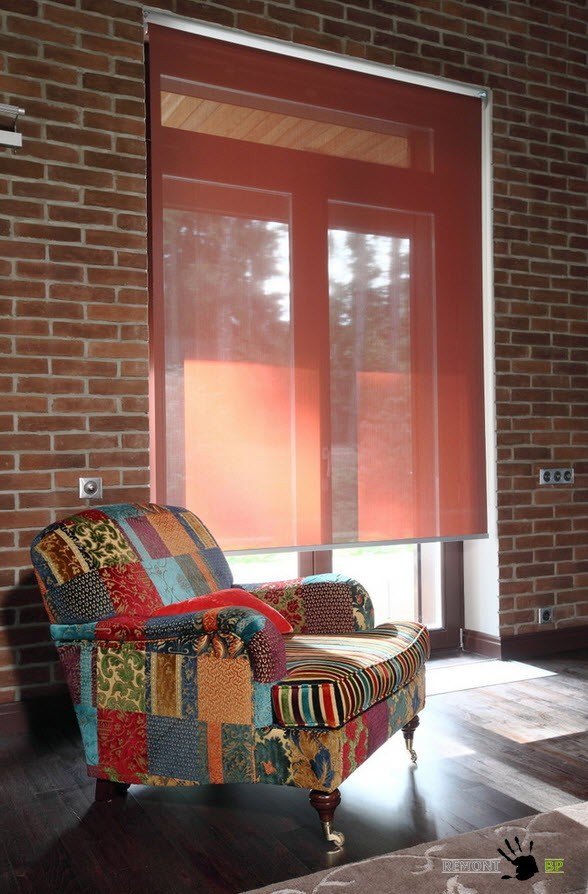 Оригинальным предметом мебели зоны гостиной и столовой, привнесшим эффект неожиданности в обстановку, стало кресло с обивкой в стиле пэчворк. Увидеть элемент интерьера, будто сделанного своими руками в помещении, оформленном по мотивам стиля лофт, мало кто ожидает. Тем важнее присутствие этого кресла и отчетливее его неординарность.