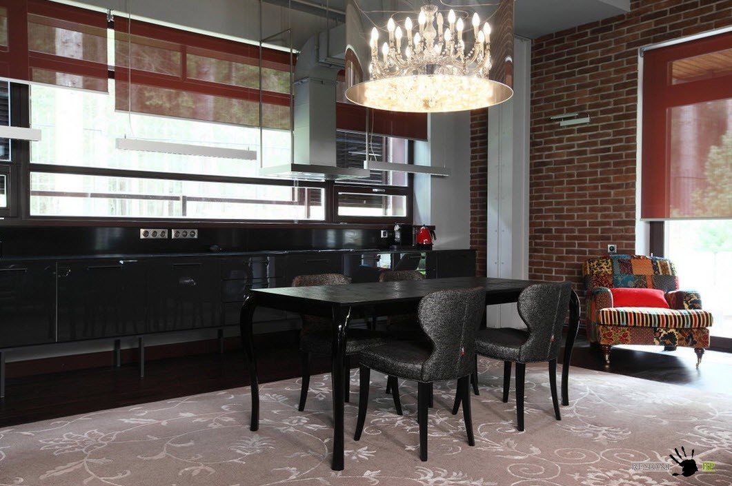Сделав один шаг из зоны гостиной, мы попадаем в сегмент столовой, где черный стол и стулья с мягкой обивкой образовали обеденную группу. Здесь же находятся рабочие поверхности и системы хранения кухонного ансамбля. Черный глянец фасадов кухонных шкафов смотрится впечатляюще. Обычно в стиле лофт текстиль для окон или не используется вовсе или ограничивается применением прозрачного белого тюля. В подмосковном доме для защиты от солнца нужно было декорировать окна рулонными шторами. Их бардовый оттенок отлично сочетается как с кирпичной кладкой стен, так и с черными оттенками меблировки.