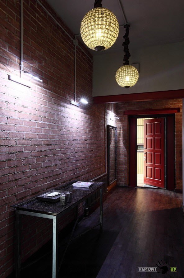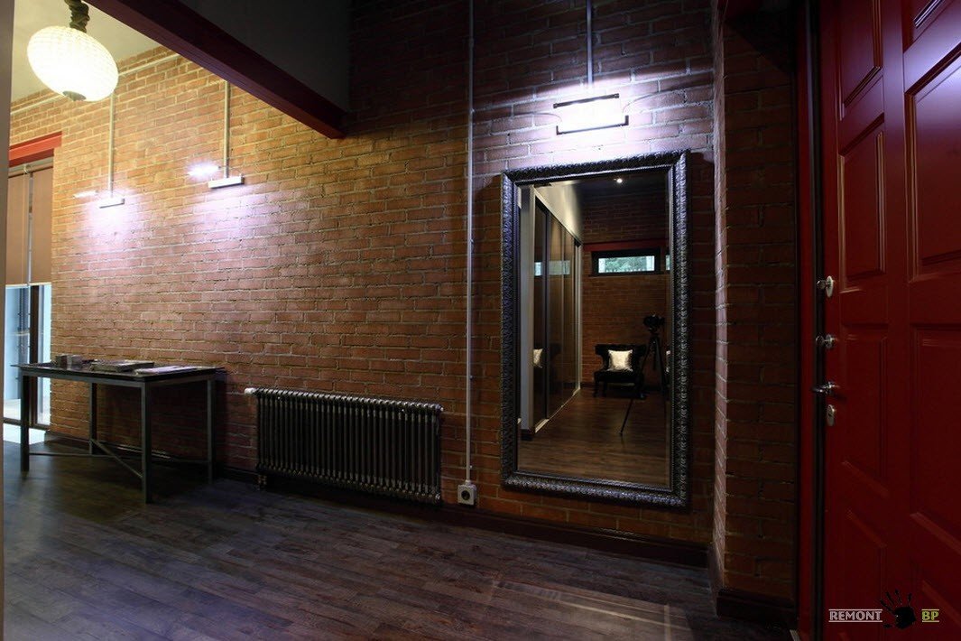 Во многих комнатах домовладения применяется контрастное сочетание брутальности (как правило, в виде кирпичных стен и индустриальных металлических предметов мебели и аксессуаров) и изящества. Именно так и происходит в прихожей, когда резная рама зеркала особенно колоритно смотрится на фоне кирпичей.