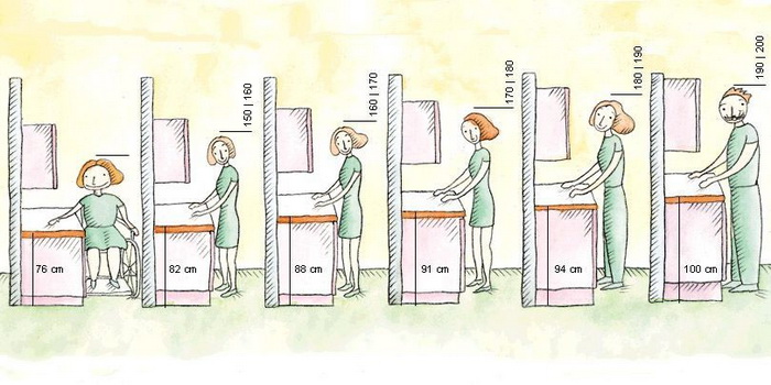 Совет! В принципе, высота кухонной мебели должна быть адаптирована к вашему росту, то есть на 10-15 см ниже высоты локтя, с допуском в пару сантиметров, когда несколько человек пользуются кухней.