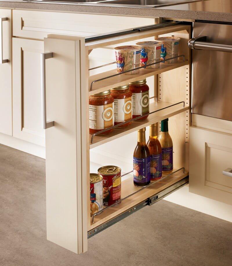 Шкафы, расположенные в углах, из-за проблемной компоновки, должны иметь хорошо подобранную внутреннюю систему, благодаря которой легко убрать из видимости предметы. В узких местах шкафа можно разместить полки, благодаря которым можно спрятать бутылки и банки.