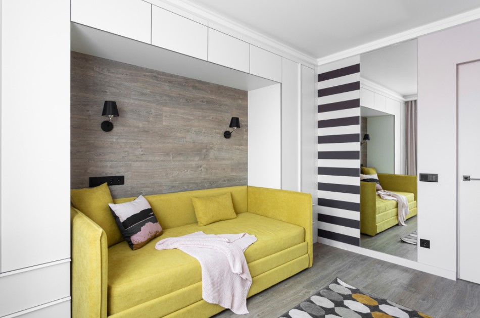 Кровать и многофункциональная мебель изготавливается из дерева с резьбой. Кровати и диваны покрывают яркими пледами и одеялами, чаще ручной работы.