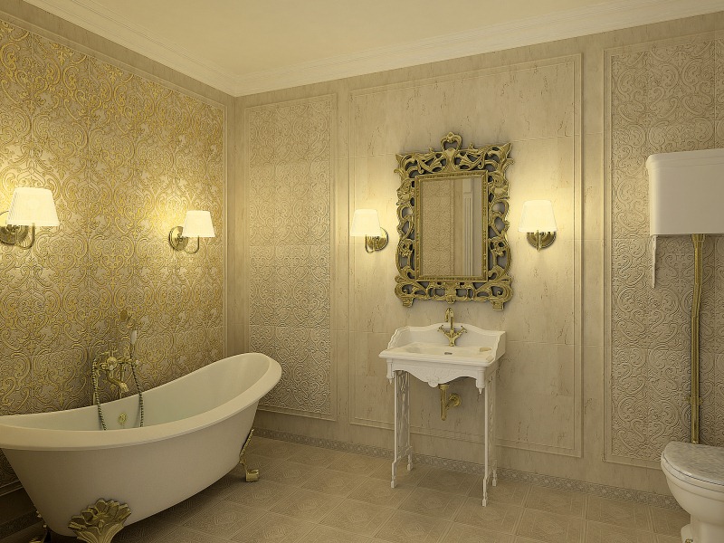 Важно чтобы ванная была ярко освещена, но не нужно забывать и о возможности создания приглушенного, расслабляющего света. Для фонового освещения тут также должны быть использованы разноуровневые источники света, а для полной релаксации и покоя лучше, если будет подсвечено одно зеркало. Для не искаженности цвета, что так важно при нанесении макияжа, нужно использовать лампы накаливания возле зеркала, в то время как для бритья подойдет люминесцентная лампа.