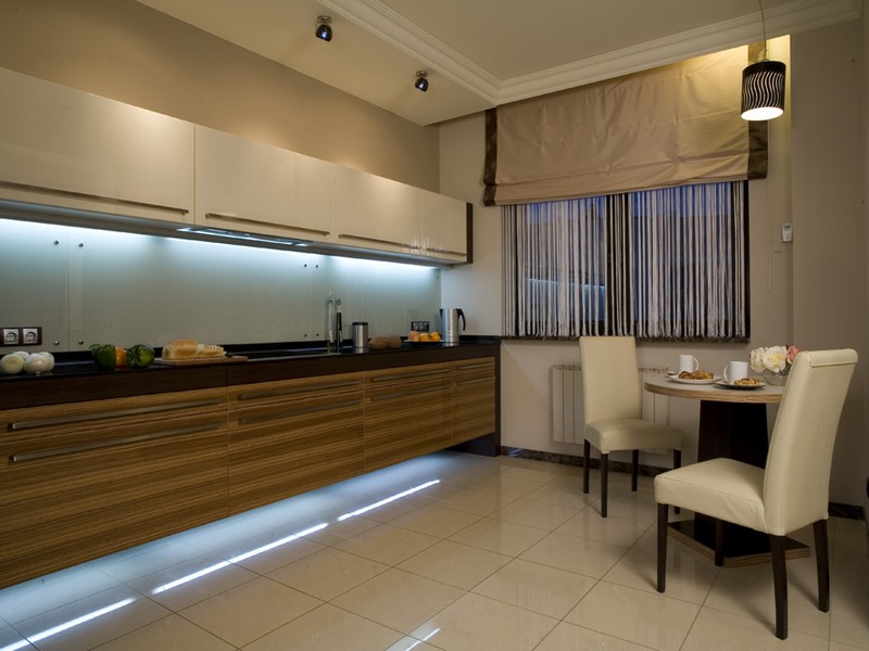 Что касается кухни, то здесь освещение должно быть функциональным. Желательно фоновое освещение, но главное чтобы все рабочие зоны были идеально освещены. Удобно, если внутрь шкафов будут встроены светильники, автоматически включающиеся при открывании дверцы. Конструкция кухонной мебели устроена так, что только при потолочном освещении на рабочую поверхность отбрасывается тень навесных шкафов, поэтому дополнительные источники света идеально впишутся по нижней плоскости шкафа. Идеальным вариантом под шкафом станут ленточные светильники, прикрепленные к стене.
