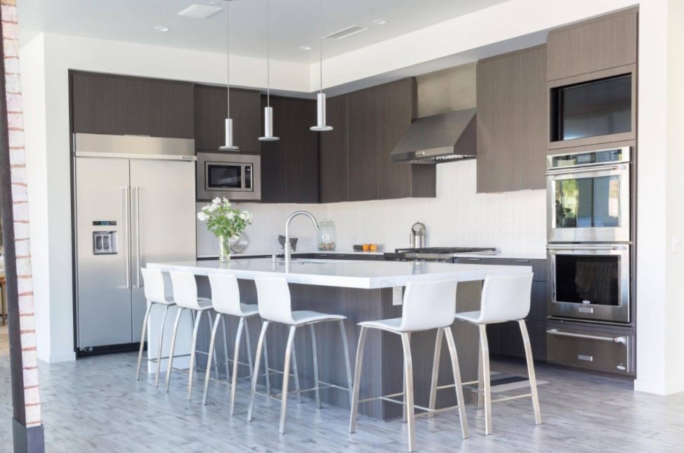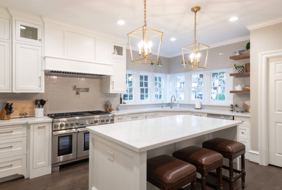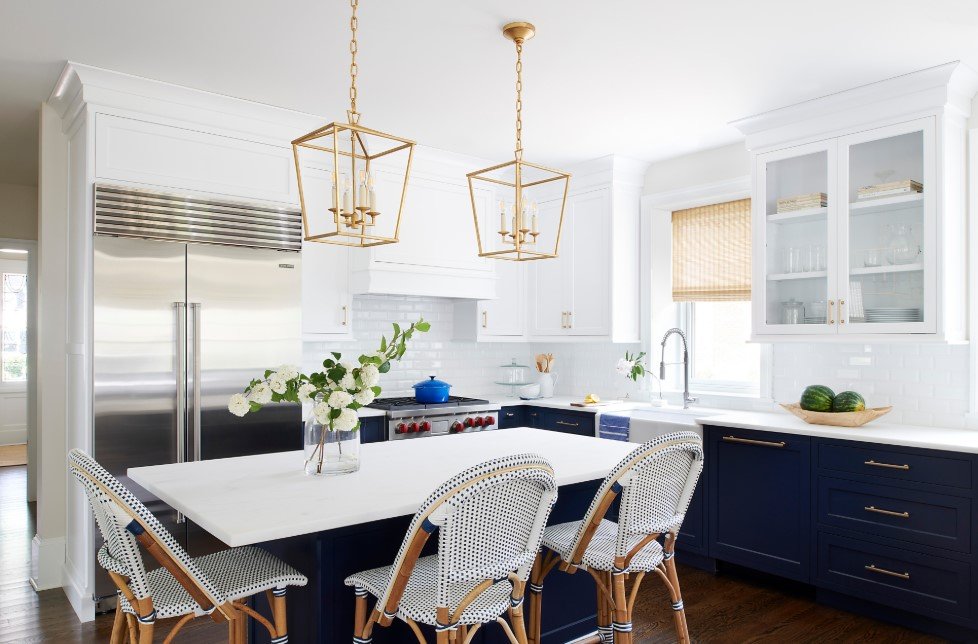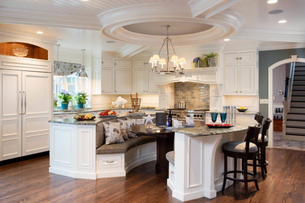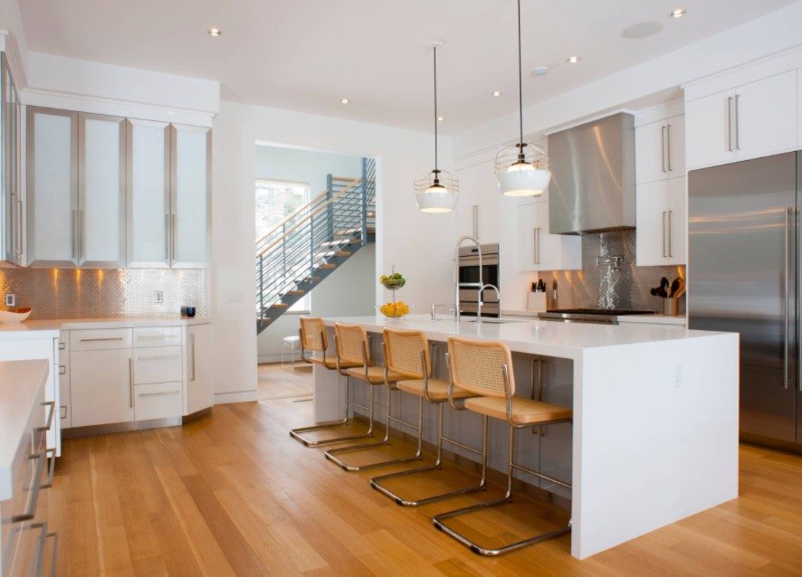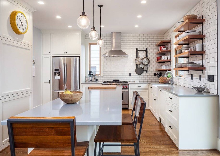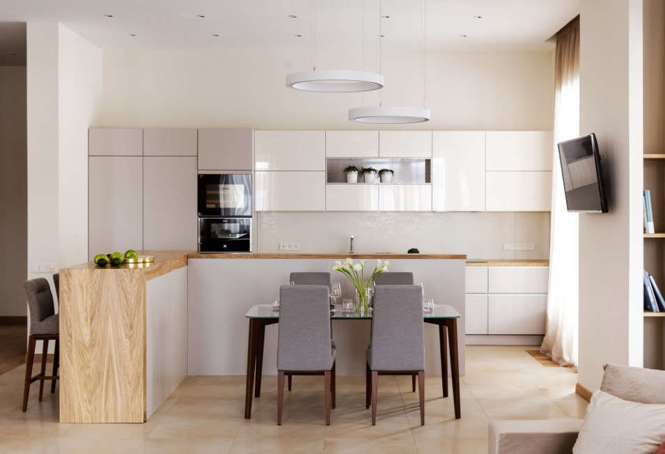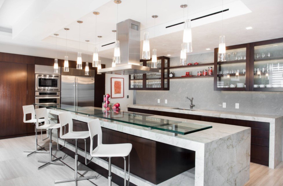 Кроме того, нужно брать в расчет форму и площадь самой столешницы. Над большими столами осветительные приборы подвешивают выше, а если оформление происходит над продолговатым столом или барной стойкой, то одним светильником не обойтись.