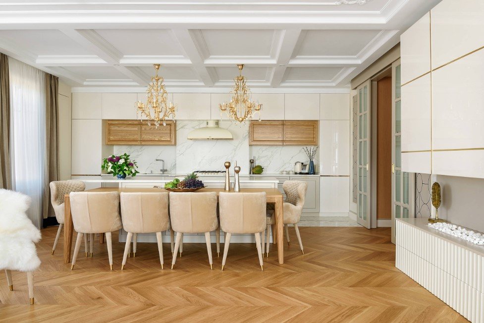 Обеденный стол всегда играл роль главного героя на кухне, в столовой или гостиной. Ведь в такой зоне отдыха обычно собираются все члены семьи за ужином или во время праздничных посиделок. Здесь же происходят встречи друзей и подруг за чашкой чая или чего-то покрепче. Поэтому не лишним будет акцентировать внимание на месте приема пищи с помощью освещения. Приятный равномерный свет сделает пребывание за обеденным столом комфортным и даже повысит аппетит.