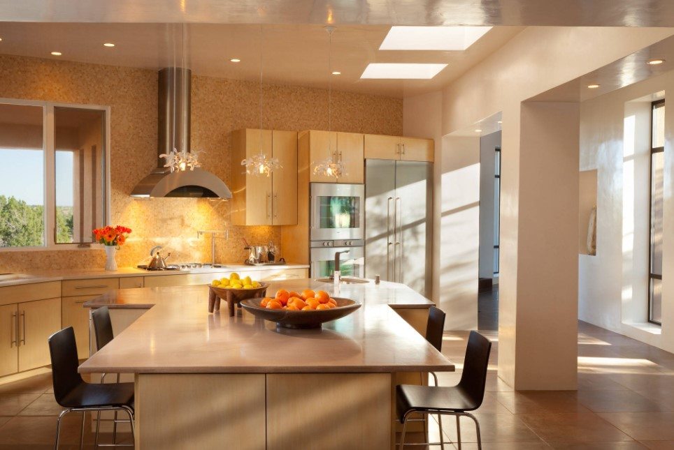 В доме с мансардными окнами естественная освещенность еще более эффективна. Проемы в потолке пропускают в два раза больше света, чем боковые. А ночью через такие окна можно наблюдать за звездным небом. Главное в таком оформлении соблюсти пропорции: мансардные окна должны занимать не менее 10% от площади кухни. То есть в случае, если кухня располагается на 9 кв.м., окна должны занимать 0,9 кв.м. поверхностей.