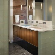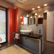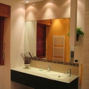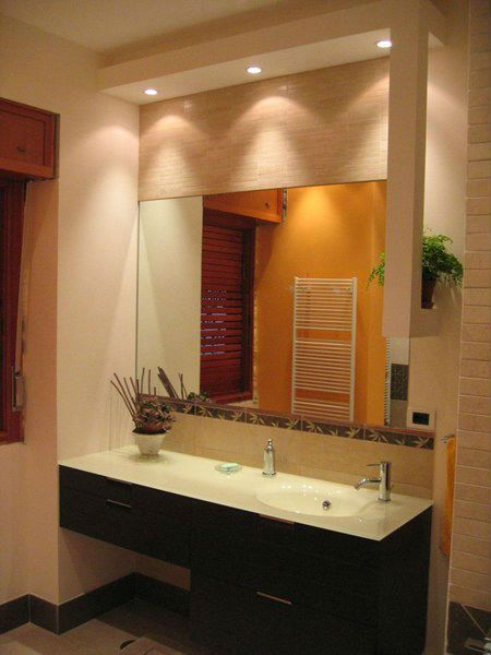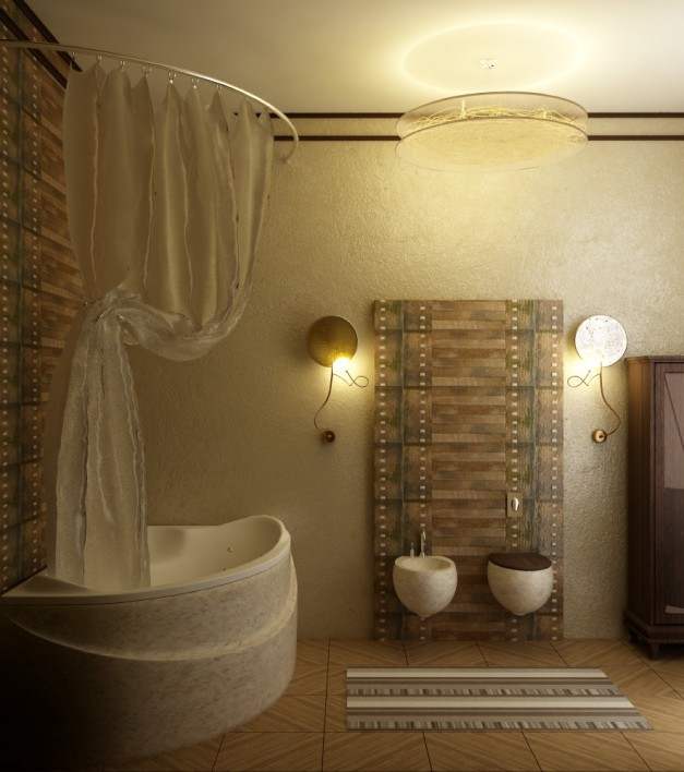 Для любителей романтической атмосферы существуют дизайнерские решения в виде напольного освещения, которое, впрочем, не исключает наличия в ванной других источников света. Также поклонников нестандартных решений в интерьере может заинтересовать регулируемое освещение в ванной, позволяющее варьировать мощность свечения лампы в зависимости от цели пребывания в ванной.