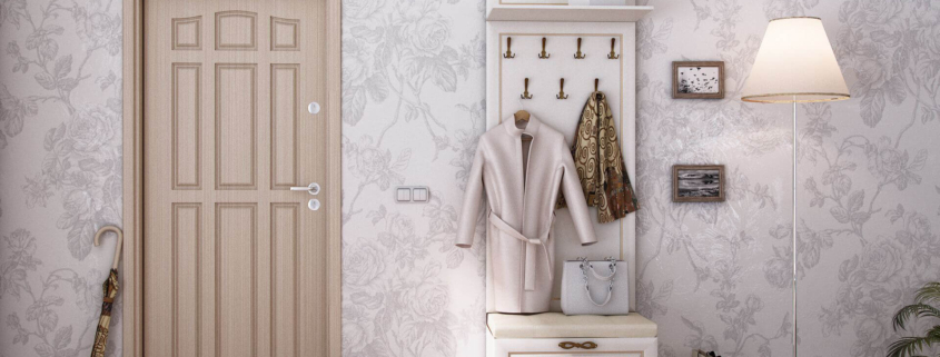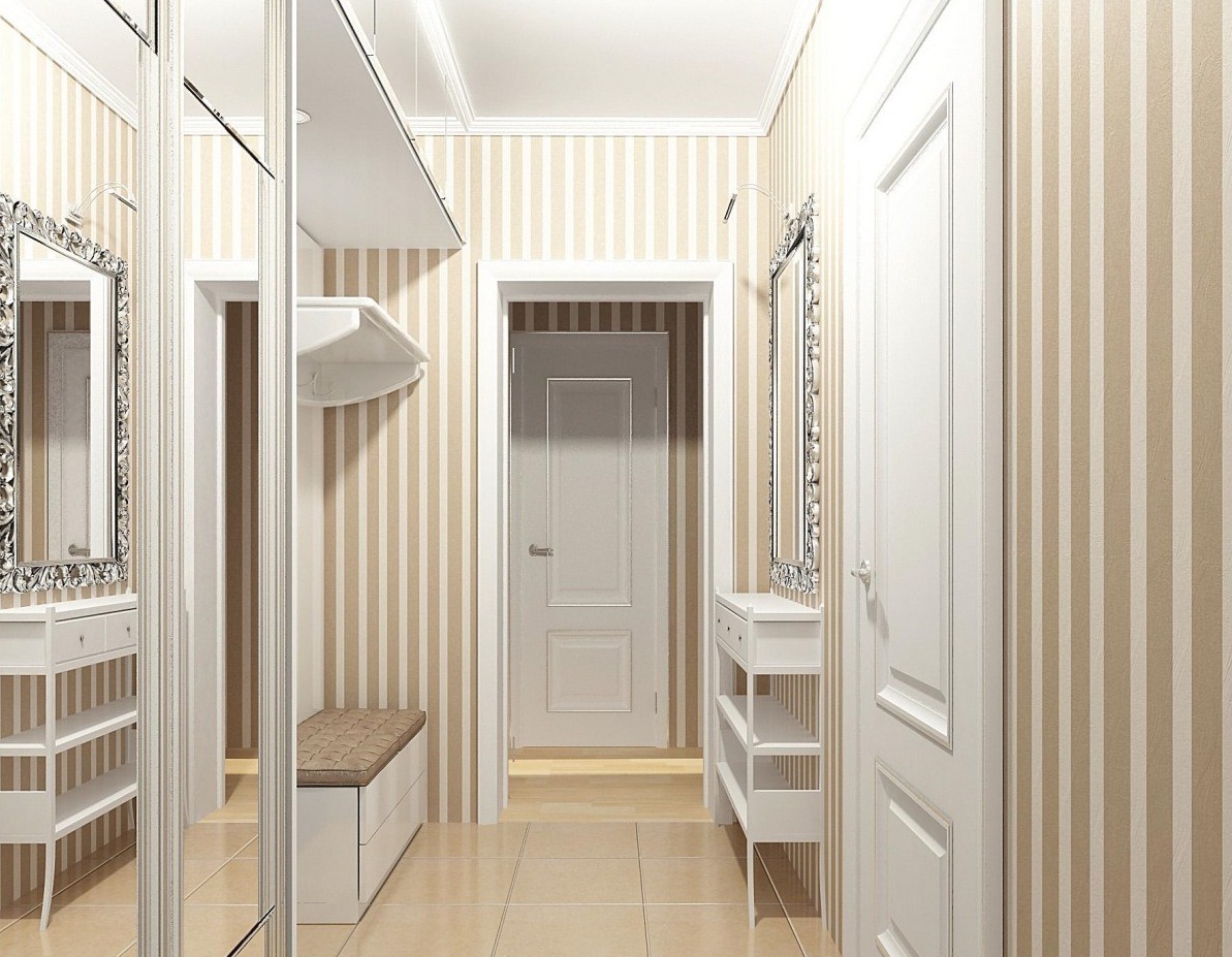 Если вы не располагаете большим пространством, то вам пригодятся советы по визуальному увеличению пространства в помещении. Для начала стоит вспомнить о том, что тёмные оттенки подчеркнут небольшой размер прихожей, исходя из этого делаем вывод: нужно использовать базовые светлые оттенки. Полосы на обоях так же играют роль.