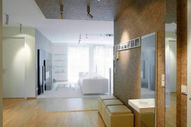 Жидкие, виниловые и флизелиновые обои можно выгодно сочетать с натуральными текстурами, такими как дерево, пробка, бамбук и другие. Касательно цветового решения можем посоветовать использовать тёмные оттенки внизу стены, а светлые размещать выше: таким образом прихожая визуально станет просторнее, а стены будут казаться выше.