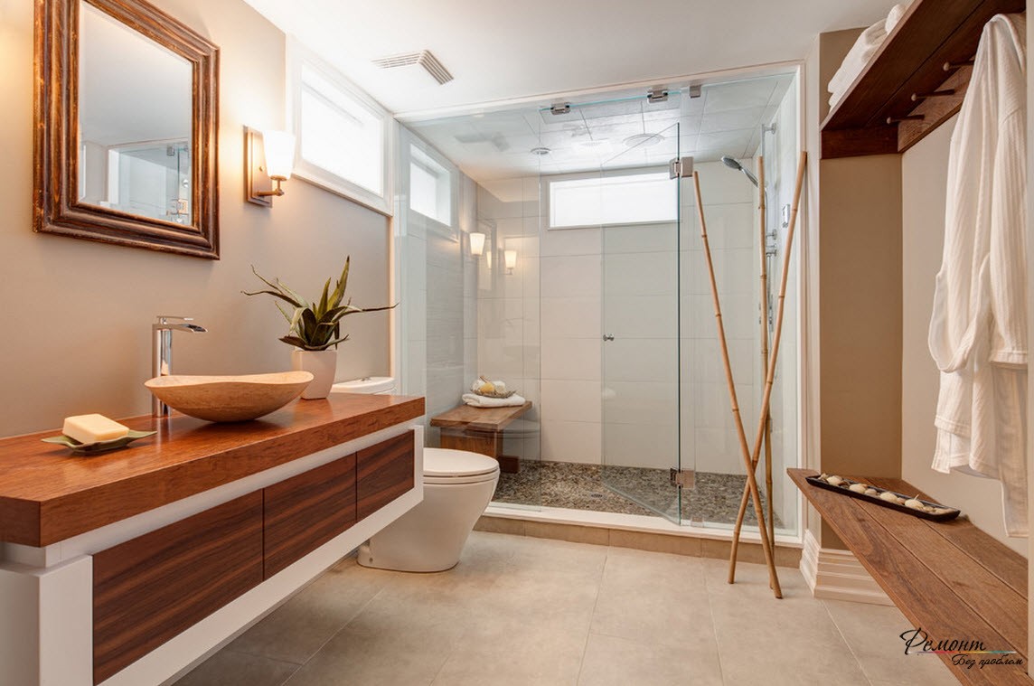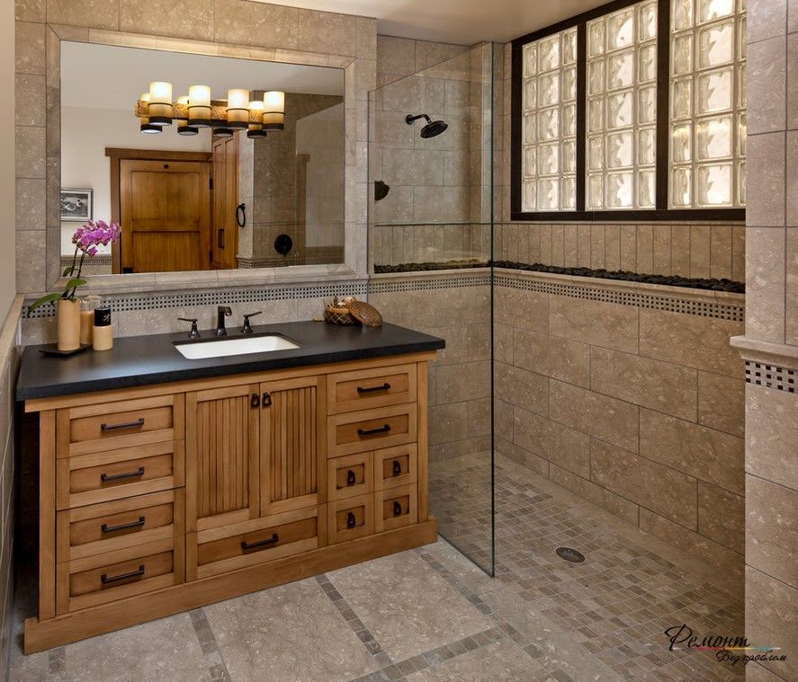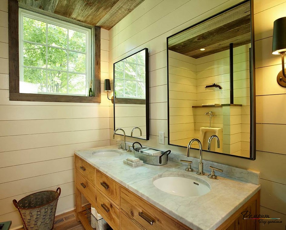 Несмотря на доминирование современных стилей интерьера, стиль кантри остается популярным. Требует обязательного присутствия грубых элементов дизайна, присутствия теплых бежевых тонов. Для этого отлично подойдет плитка с фактурой в виде камня. Незаменимой будет пластиковая панель, текстурированная под дерево. При таком стиле и соответствующей отделке, ванная комната будет для вас чем-то сокровенным и освобождающим от всех тягот жизни.