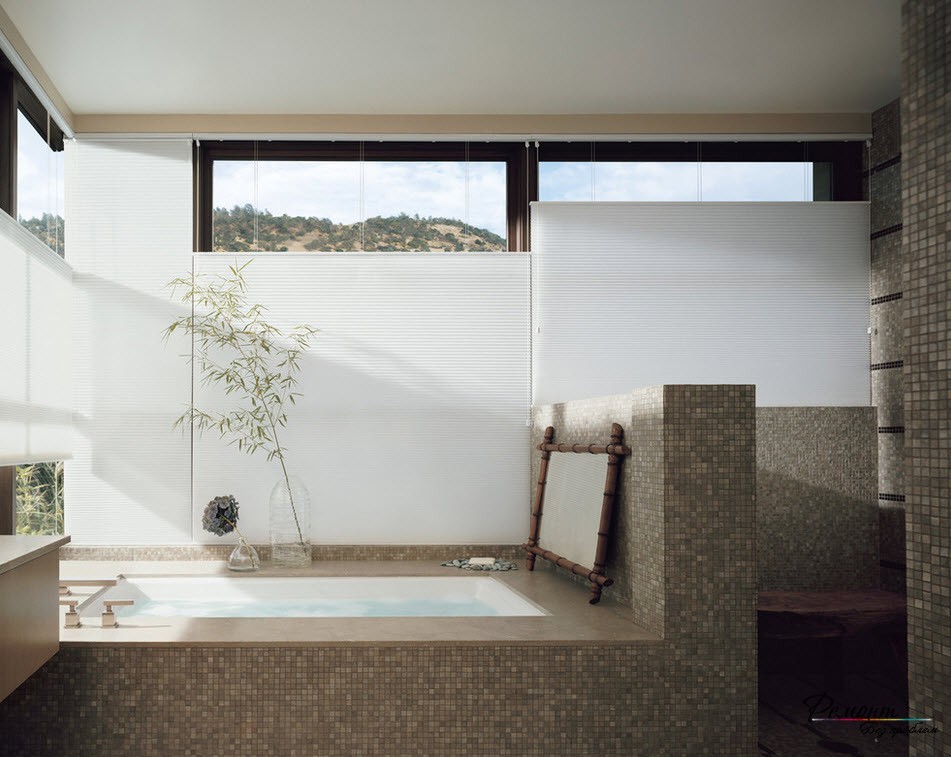 Ванная может быть вмонтирована в своеобразный подиум, который отделывается в пределах ваших возможностей и фантазии. Отделка ванной может быть выполнена в упрощенном варианте. Это отделка простой керамической плиткой или мозаикой.