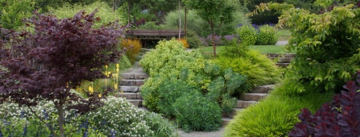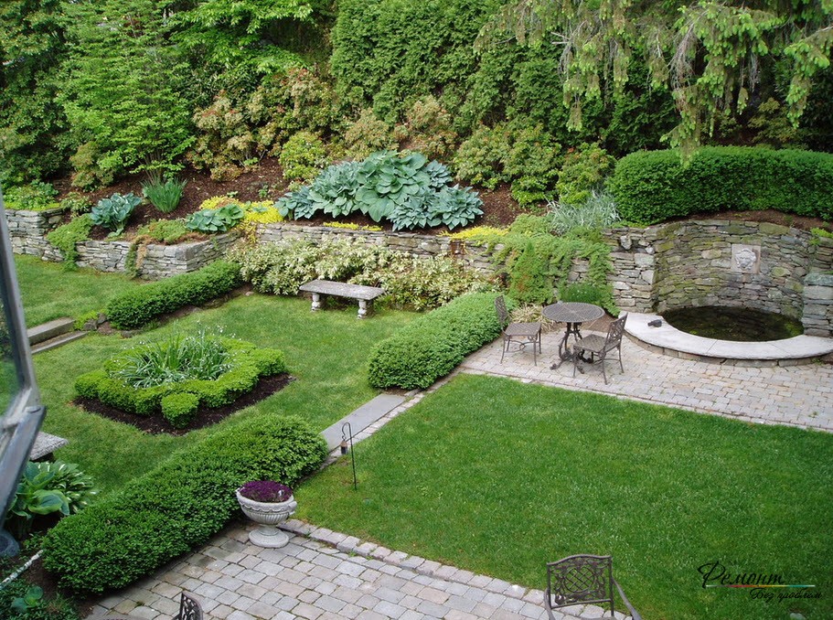 - рельеф: садовые дорожки, высадку растений, художественные конструкции располагают в зависимости от этого фактора. Например, водоемы устраивают в самой низкой части участка, а альпийские горки – в самой высокой. Участок с уклоном можно облагородить многоуровневыми террасами и декоративными стенами. Высадка растений также зависит от рельефа: важно учитывать солнечные и теневые места. Солнцелюбивые растения следует высаживать в самых высоких точках, а тенелюбивые – в самых низких. Также при посадке растений следует учитывать распределение влаги на неровном участке.