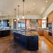 Кухонный остров прекрасно смотрится на больших кухнях. Во-первых, это очень удобный акцент, который позволяет увеличить рабочую поверхность. Во-вторых, такое решение придает каждому интерьеру интересный вид. Планируя остров на своей кухне, не забудьте отрегулировать его высоту так, чтобы удобно было сидеть на стульчиках (около 110 см в высоту). Также соблюдайте расстояние между островом и шкафами — минимум 90 см.