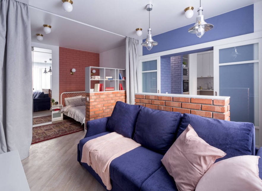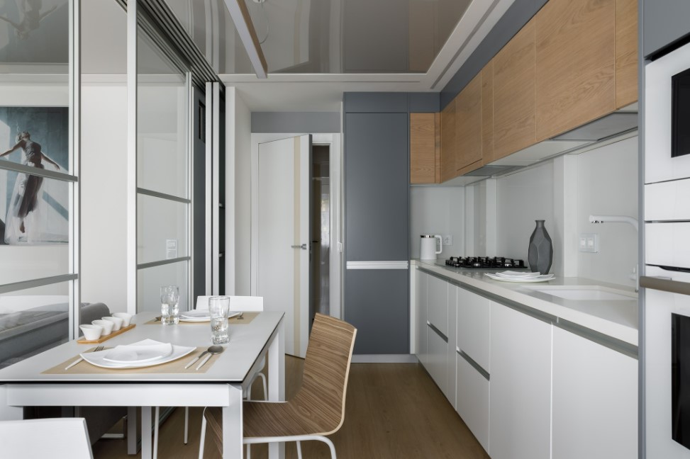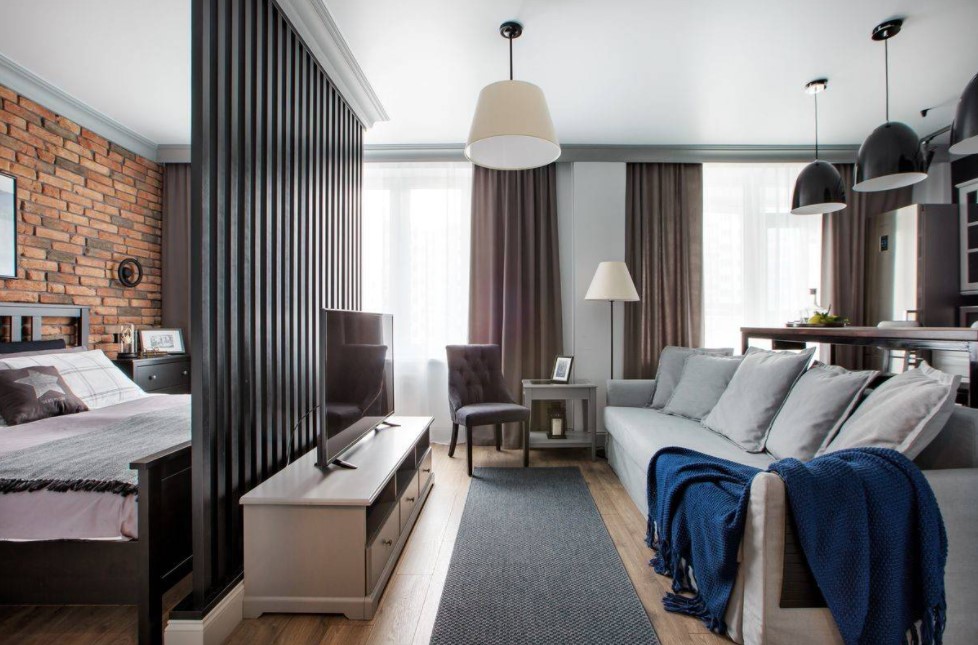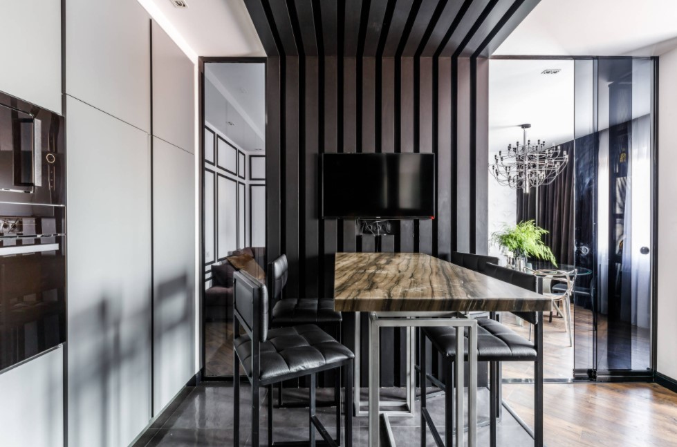 Перегородкой может быть универсальный или раздвижной элемент на случай, если комнаты понадобится изолировать. Так во время готовки перегородка не пропустит запах еды в жилое пространство.