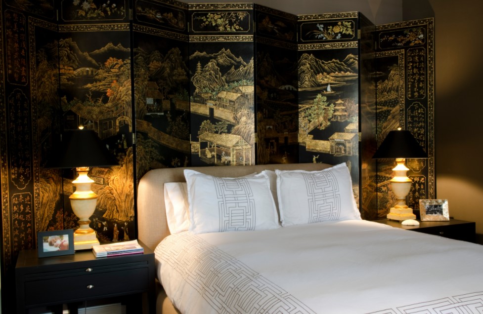Традиционно для оборудования гардеробной в спальне используют ниши, выступы или кладовки для систем хранения вещей, а закрывают зону гардеробной с помощью встроенных мебельных конструкций или перегородок. Отличный и функциональный вариант – перегородка в виде ширмы. Ширма – это переносная и складная перегородка, возникшая давным-давно в Китае как элемент интерьера спальни для переодевания.