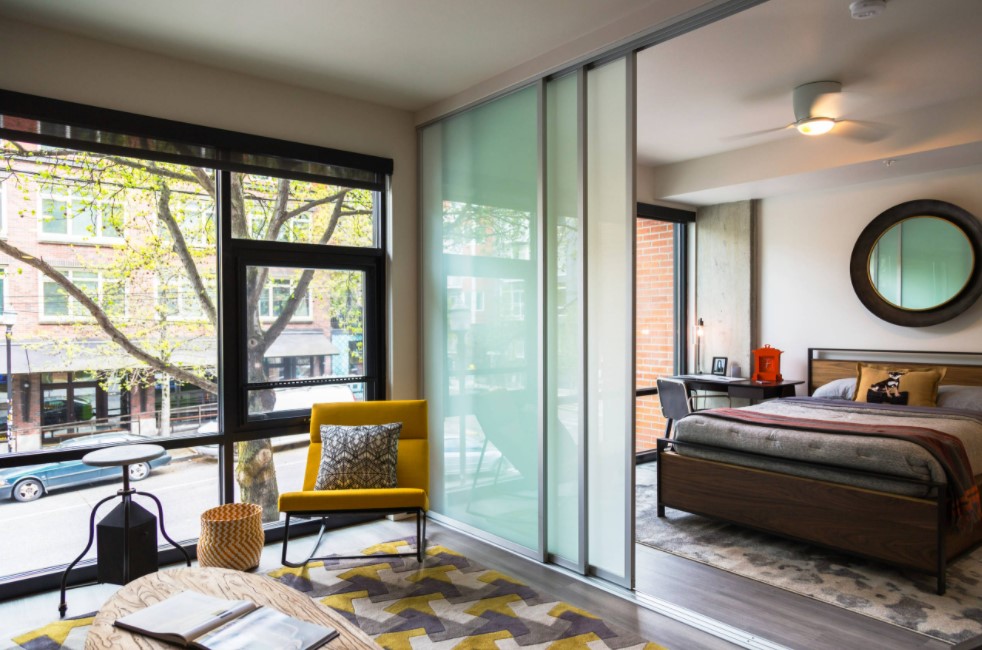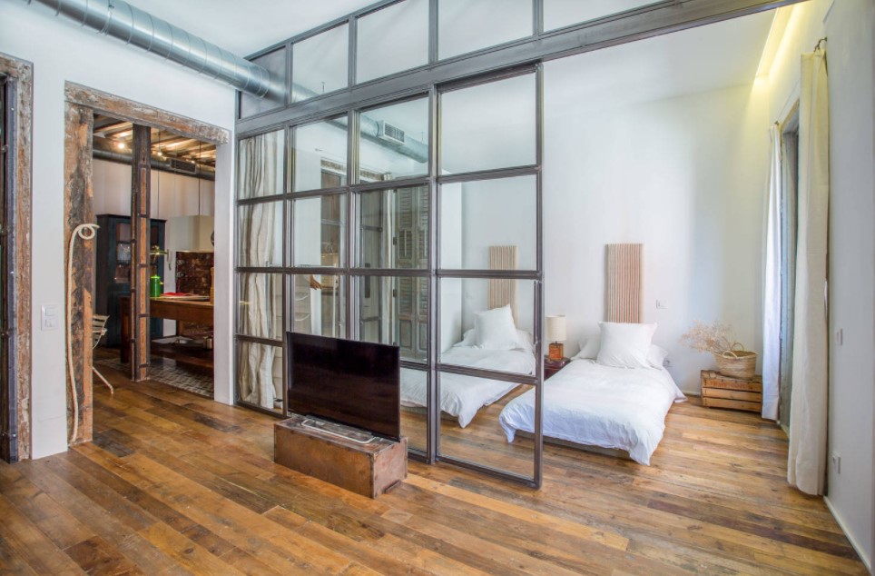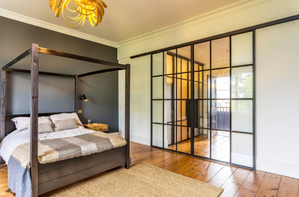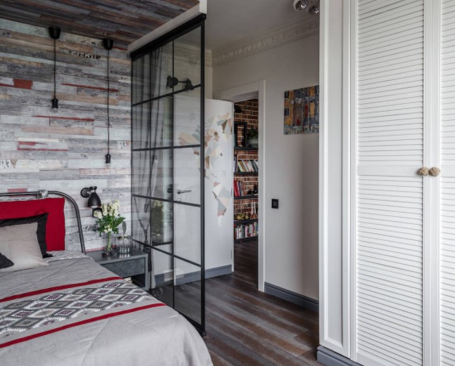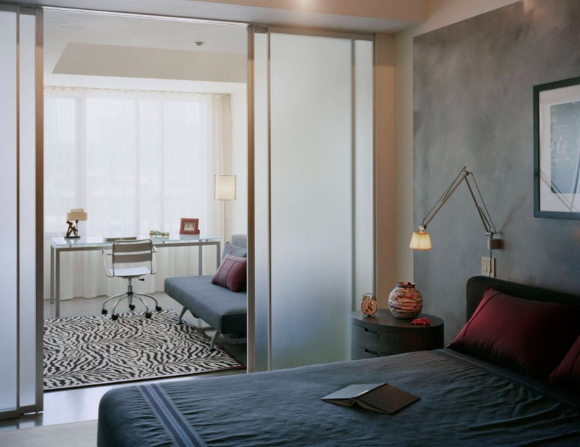 Раздвижные перегородки для спальни представлены в нескольких оригинальных вариантах. Один из таких интересных вариантов – раздвижные наклонные двери – простые в эксплуатации, с достаточным уровнем звукоизоляции, стильного внешнего вида.