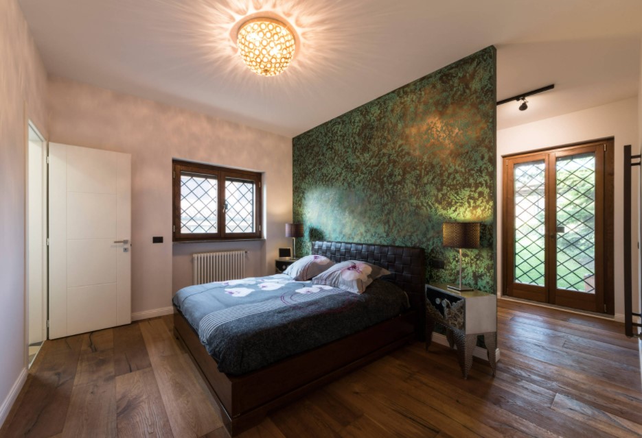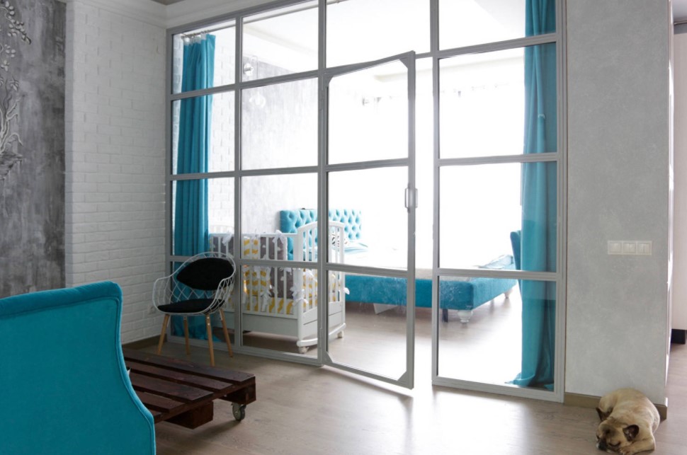 Перегородка из стекла – невероятно эффектный и изысканный вариант, который выгодно отличается возможностью проникновения естественного и искусственного света. Такую перегородку для спальни можно заказать в разноцветном стекле или с песочным орнаментом. Часто стеклянные перегородки декорируют с помощью матового покрытия, декоративных узоров, орнаментов и декупажа. Все чаще при изготовлении перегородки используют более дешевый, безопасный, легкий аналог из высококачественного пластика.