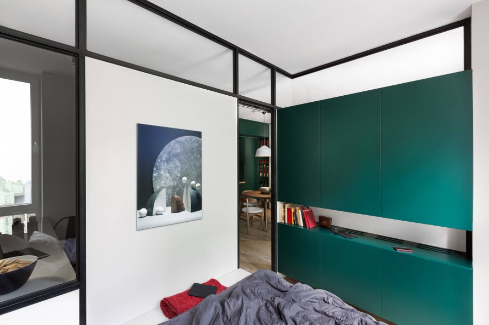 Отличная идея зонирования пространства спальни с помощью шкафа-перегородки пользуется заслуженным спросом. Во-первых, такая перегородка одновременно статична, но при этом может легко перемещается при необходимости. Во-вторых, шкаф-перегородка экономит важные сантиметры полезной площади спальни за счет систем хранения внутри шкафа-перегородки. В-третьих, такая перегородка не просматривается, что особенно важно, когда необходимо спрятать спальную зону.
