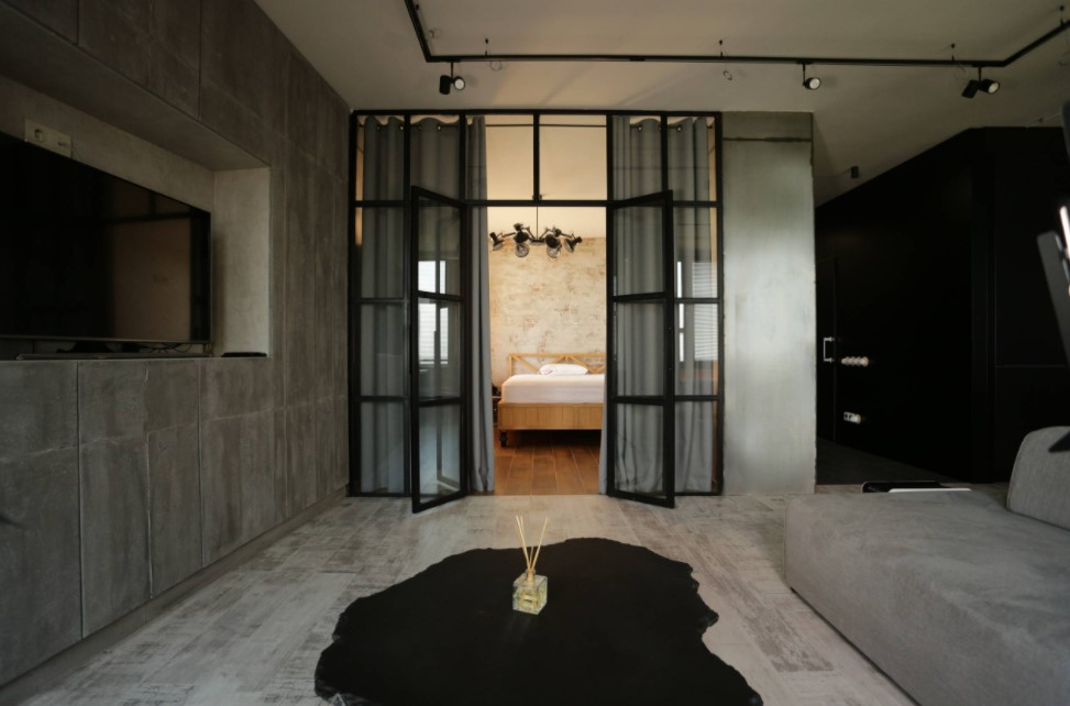 Еще один достойный вариант – раздвижная перегородка с рельсовым механизмом как у шкафа-купе. В числе преимуществ – экономия пространства за счет эргономичного способа открытия дверей, удобство, стильный дизайн.